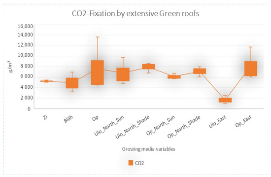 The better growth rate on the 10-cm media is related to the different growing media used in these tests. Figure 6 shows the median values for CO2 fixed by the plants, which varies considerably, with the lowest values of about 2000 g/m2 on the Ulo media compared to average values of about 6000 g/m2. In isolated cases, values that are twice as high are possible. If CO2 fixation is to be the primary aim of the roof, careful choice of the media plus fertilizer is one solution. Calculating based on the approximately 8.5 million m2 new green roofs realized in Germany [13], this will result in carbon storage of between 17,000 and 51,000 t CO2/year after a few years.