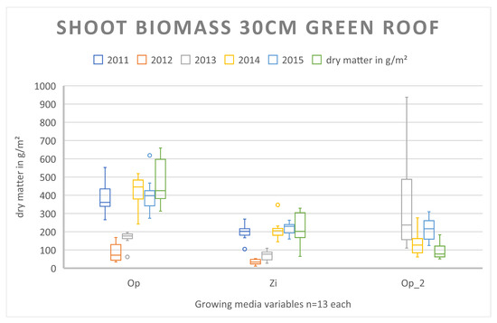 These dry matter calculations were based on the 30-cm depth substrates, and the above-ground phytomass was harvested as described in Section 2. The 3 groups of 13 planter boxes were used in the following statistics. In the years between planting in 1999/2001 up to the first harvests in 2011 on building 2 and in 2013 on building 3, no harvesting of the plants influenced the typical growth of these plots. Working on the principle that extensive green roofs do not need maintenance, we allowed them to grow untouched for the first 10 years. The decline in the appearance was the initial reason for starting maintenance, which included mowing of the meadow. This means that the first years of harvesting, 2011 and 2013, respectively, have higher values than the annual productivity in the following years; see Table 9 with the standard deviation values.