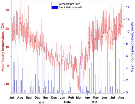 The city has temperate continental climatic conditions, with a mean annual precipitation of 567 mm. The annual average temperature of Wroclaw is 10.2 °C (mean by decade 2008–2019), with the coldest month January (−0.1 °C), and the warmest July (20.2 °C) [35]. Warm and humid weather conditions are common in the summer; the winter season is relatively mild with moderate and changeable temperatures [36]. Prevailing wind directions are typically west and south with an average speed of about 2.5 m·s−1, according to records collected by the meteorological station located at the Copernicus Airport Wroclaw [37]. Air temperature and amount of precipitation for the city of Wroclaw recorded by the meteorological station located at the Copernicus Airport Wroclaw between July 2017 and August 2018 are shown in Figure 1 [38].