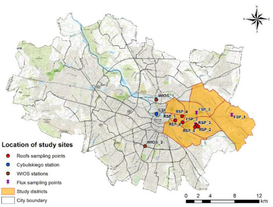 Location of study districts in the Wroclaw urban area. The measurement points are marked as: soil flux observation set/biogenic fluxes (violet pushpins), rooftop-level measurement sites (red points), location with on-site continuous diurnal series measurements (blue point); measurement stations operating by Inspectorate of Environmental Protection (dark red). The marks “RSP_1-6” indicate rooftop-level measurement sites, “FSP_1-3” soil flux sampling places, “CSt” means a location with continuous diurnal series measurements (“Cybulskiego station”), WIOS_1-2 are, respectively, measurement stations operating by Inspectorate of Environmental Protection. Base map source [41].