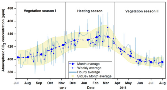 The time-series of measured CO2 levels indicated clear seasonality as a result of natural processes and human activity. In the vegetative season, the biological impact through the photosynthetic carbon fixation is dominant while the anthropogenic impact is minimized. Conversely, in the heating season, the anthropogenic CO2 sources are predominant, while photosynthesis uptake of CO2 by cover vegetation is negligible. According to the seasonal cycle of carbon dioxide, for most of the measurement sites, a marked increase in CO2 concentrations was observed in late autumn (from November) caused by a decrease in air temperature and related to higher energy consumption for electricity and heating purposes. The decline in concentration was recorded in early spring (at the end of March and April) due to the longer duration of sunshine and coupled changes in the vegetation distribution (plant respiration and uptake). The measured average concentrations for atmospheric CO2 ranged from 380 to 440 ppm with a mean of 412 ± 3.1 ppm for the vegetation season; and the maximum concentrations for CO2 were observed in the heating season, in the range of 410–470 ppm with a mean of about 430 ± 3.8 ppm in winter (Figure 3). Thus, the derived seasonal variation in atmospheric CO2 concentration reaches up to 25–30 ppm, which is consistent with the majority of previous studies [63,64,65,66].