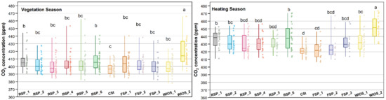 The compared means of atmospheric CO2 across the majority of the study sites were relatively close and do not demonstrate extreme values in the vegetation season (Figure 4). A peak in CO2 concentration (median mean of 414 ppm) was only measured at the “WIOS_2” on-road traffic station. Although slightly higher concentrations were measured in the “RSP_1” and “RSP_6” sites, located near heavy traffic roads. Three stations (“RSP_3”, “CSt”, “WIOS_1”) that were furthest from the heavily congested roads and associated with the urban greenery showed the lowest concentrations of CO2 (median mean below 397 ppm) observed during the vegetation season. From the results of pairwise comparisons of recorded CO2 in most of the observation locations, it can be concluded that there was a significant difference in CO2 measurements in the heating season. The winter CO2 maximum was also observed in the “WIOS_2” measurement station (median mean over 450 ppm). For some sites, such as “RSP_1” and “RSP_6” the measured atmospheric CO2 concentrations were characterized by peaks (median mean up to 440 ppm), predominantly caused by emissions from anthropogenic sources. Furthermore, the amplitude of the CO2 concentrations measured in the heating season indicated that the meteorological episodes (mainly, air temperature fluctuations) contributed significantly to the high variation in CO2 values within sampling groups (interquartile range on box plots).