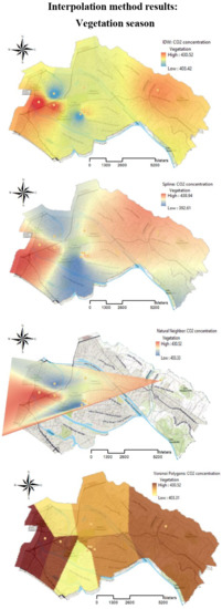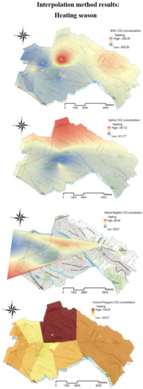 According to the results obtained from different interpolation methods, the quality of various predicted surfaces for the vegetation and heating seasons were identified. IDW, spline, and natural neighbour (NB) approaches showed some similarities in the produced surfaces. However, natural neighbour prediction led to accurate values mainly within a short distance in sample points location. IDW and spline interpolation gave a consistent, but poor performance for the seasonal CO2 distribution since the surface is highly susceptible to edge effects (unsampled locations) and clusterization (clustered sample points). The lowest and highest values obtained by Voronoi (Thiessen) polygons were representative of the original data range, however, the prediction had a much greater morphology of the map (high differentiation between colour ranges) and did not represent realistic dispersion conditions for CO2 emission.