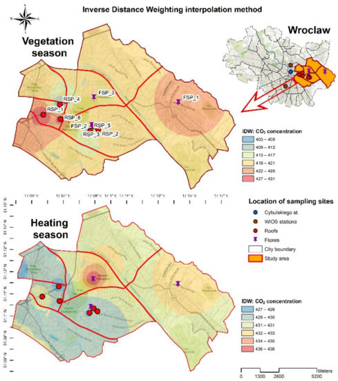 The IDW interpolated surface (Figure 7) represents the best quantitative and accurate results of CO2 dispersion in the atmosphere compared with other interpolators in this study. The predicted mean CO2 values were highest in the heating season (nearly 431 ppm) compared to the vegetation (mean 411 ppm). However, the IDW method works best for the dense enough, evenly-spaced sample point sets, that is why the formatted feature class cannot be sufficient to capture local CO2 concentration variations in the Wroclaw urban area.