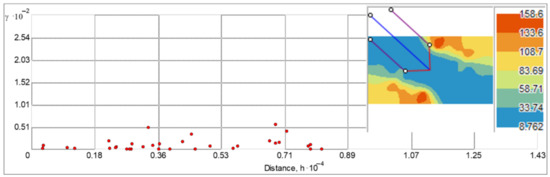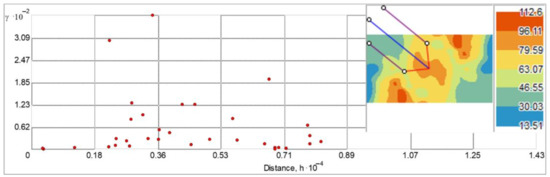 The next step for spatial analysis of these parameters was to form the empirical semivariogram that provides information on the spatial autocorrelation of datasets. The experimental semivariogram of a dataset for the vegetation and heating periods with its semivariogram curves is shown in Figure 16. There can be observed deviations of the points on the semivariogram from the averaged values—some points are above and below of the model curve. These variations could be the result of direction (anisotropy) trends, labeled on semivariogram surface/maps (see maps in a corner), or some unmeasurable physical process of pollution dispersion.