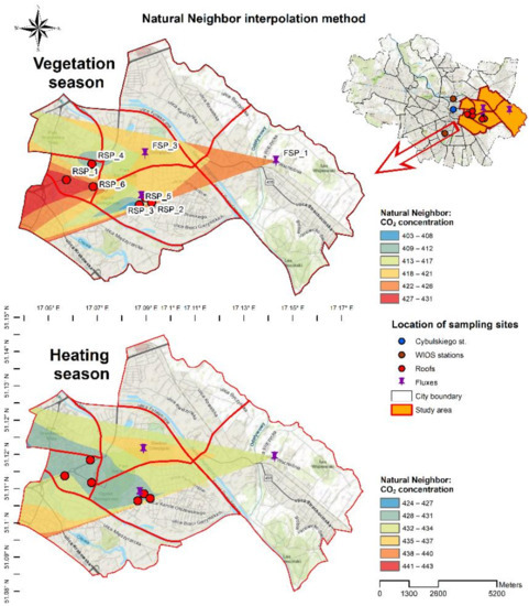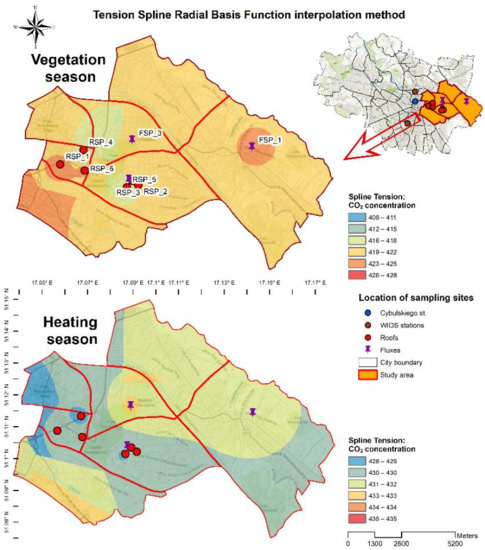 Based on the spatial similarity of the spline interpolated surface, it is difficult to highlight the obvious seasonal cycle of CO2 emissions from an urban area. The spline function modelled spatial distribution map shows no large differences in carbon dioxide concentration under the vegetation and heating conditions (Figure 10). The CO2 values are more dispersed, with higher values (419–420 ppm and 428–431 ppm for vegetation and heating period, respectively) in the central part of the area.