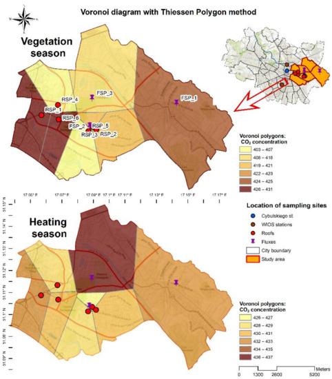 GIS coupling mapping of spatial CO2 distribution in the vegetation and heating seasons, a surface produced using the Voronoi diagram with the Thiessen polygons method.
