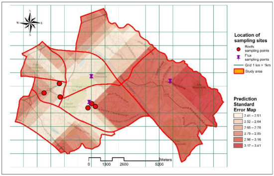 Ordinary kriging prediction standard error map with the grid (1 km × 1 km) within a particular study area.