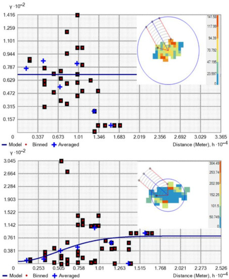 We studied the anisotropy by managing search direction and showing its impact on the spatial correlation structure for a given, generally low number of observations (vegetation vs. heating season). The direction of anisotropy was determined by estimating semivariograms in multiplane directions. The semivariograms and semivariogram maps with search direction used to determine the presence and direction of anisotropy in the data in the vegetation and heating season (pattern of spatial correlation to be stronger in certain directions) are shown in Figure 8. Clear anisotropy that was found with direction labeled in semivariogram surface/maps, especially in the heating season, might suggest the spatial variability of the observed data. In general, the spatial correlation of the data in the direction perpendicular to that represented in Figure 8 is lower than that parallel to it, whereas the anisotropic model reaches the sill more rapidly.