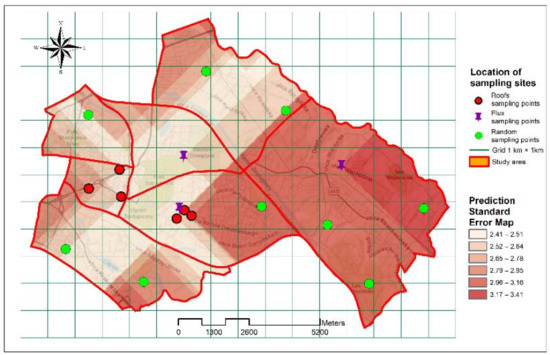 Spatial optimization from the kriging model indicates that there is a need to locate additional sampling points, especially in southern and southeast directions (values of the highest standard errors of prediction). A random sampling strategy was used to determine the new distribution of sample points by the reconstruction of the air sampling network density, especially in unmeasured locations. By using kriging interpolation (Figure 17) and the random points tool in ArcGIS software the error map was created, where the future sampling campaigns can be planned and a more realistic representation of CO2 distribution across the most problematic parts of the study area should be achieved.