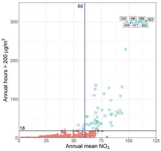 The number of hours where NO2 exceeded 200 g against annual mean NO2 for each site-year datapoint. Open points have more than 18 exceedances and closed points have less than or equal to 18 exceedances. A horizontal black line is drawn at 18 h for clarity. Points in the top right hand corner are all plotted at 400 h to compress the y-space needed for the graph and the actual values are shown in labels. A vertical line is shown at 60 g which represents the heuristic that is supposed to separate closed from open datapoints.