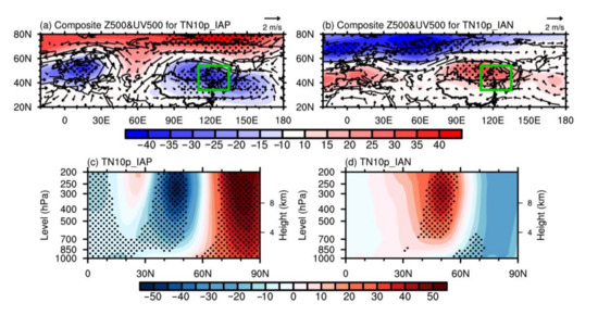 During the years of frequent WELT, NEC is occupied by significant negative geopotential height anomalies at 500 hPa with a central value exceeding −30 gpm (Figure 6a), denoting the strengthening of EAT [29]. Further to the north, positive geopotential anomalies extend along the Barents-Kara Seas (Figure 6a), indicative of a weaker polar vortex. The anomalous geopotential distribution represents the negative AO phase, which is consistent with the cold extremes in northwestern North America [30]. Opposite geopotential anomalies and AO phase occur during years of rare WELT (Figure 6b). We further plotted the composite vertical section of geopotential anomalies along 120° E for the TN10p_IAP (Figure 6c) and TN10p_IAN (Figure 6d) years, respectively. For TN10p_IAP years, the height dipole with negative height anomalies in NEC and positive height anomalies in the polar region is statistically significant, whose center is located at around 250–300 hPa (Figure 6c). However, the northern part of the height dipole is not significant, although the positive height anomalies are prominent in NEC (Figure 6d).
