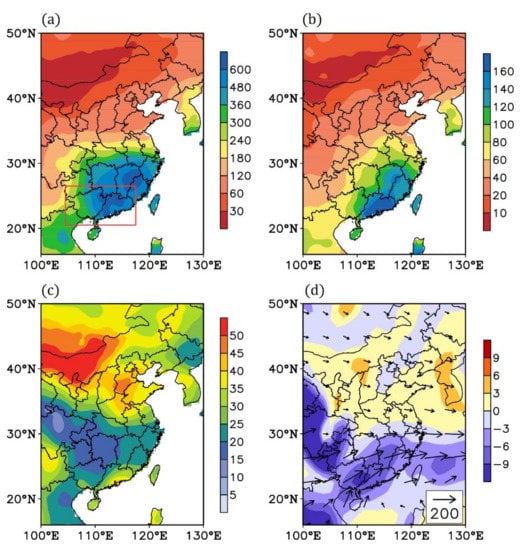 Figure 1a shows the multi-year averaged precipitation in spring (March, April, and May) over eastern China. Before the monsoon season, spring precipitation exhibits an evident meridional gradient: it rapidly decreases from the south to the north. In particular, over the southeastern coastal area, the total spring precipitation even reaches about 600 mm. Meanwhile, the interannual variability of spring precipitation there is also relatively larger (Figure 1b), which reaches about 100–160 mm. In general, the interannual variations in spring precipitation contribute more than 20% of the total spring precipitation over South China (Figure 1c). Considering that South China is densely populated and largely dependent on agriculture, such a strong variability in spring precipitation is worthy of attention. Generally speaking, precipitation anomalies are mainly attributed to atmospheric circulation variations [,,,]. As shown in Figure 1d, the water source of spring precipitation over the southern part of China is mainly due to the moisture transport associated with the southwesterly wind. Over South China, there is a convergence center of water vapor, forming a relatively larger local spring precipitation. This is easily affected by low-level atmospheric circulation changes, leading to precipitation anomalies [].