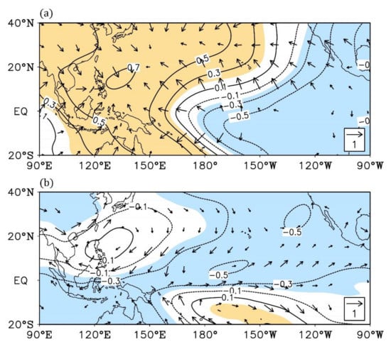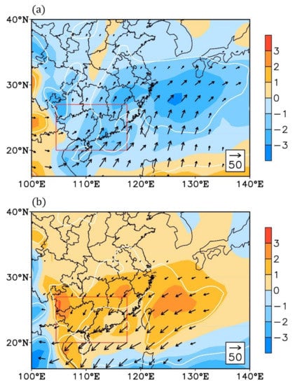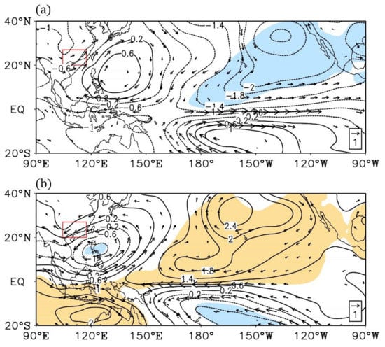 As mentioned above, ENSO is one of the most important climatic driving factors, and evidently affects the atmospheric circulation, especially over a tropical area [,,,]. Figure 2 demonstrates the correlation distribution of high- and low-level atmospheric circulation in the decaying spring with the preceding winter ONI. At the 200 hPa level, the velocity potential exists for strong negative and positive correlations over the tropical eastern and western Pacific, respectively (Figure 2a). Accordingly, the high-level wind diverges and converges over the eastern and western Pacific, respectively. Under this circumstance, there usually is an abnormal upward motion associated with the abnormally warmer SST over the tropical eastern Pacific in the decaying spring. On the other hand, above the western Pacific, the air features an abnormal downward motion, which is a response of the Walker circulation system to the El Niño events [,,]. The low-level atmospheric circulation is also affected by the anomalous ENSO SST. Over the western North Pacific, coupled with the abnormal descent, an anomalous anticyclone forms at 850 hPa to the southeast of China during the decaying spring (Figure 2b). Theoretically, the low-level circulation anomaly affects the spring water vapor flux. In the decaying spring of El Niño, the enhanced southwesterly wind would transport excessive moisture from the South China Sea to South China, increasing the local precipitation []. The whole situation generally turns to be the opposite in the decaying spring of La Niña.