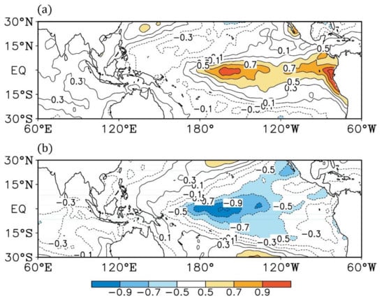It is well known that the El Niño—Southern Oscillation (ENSO) is one of the most important drivers of natural interannual climate variability []. It not only exerts a great influence on the tropical marine environment and weather/climate states, but also affects the global climate, and even leads to variations in extreme weather events globally [,,,,,]. Therefore, as the most important climatic phenomenon in the tropical Pacific, ENSO has attracted lots of attention from scholars [,]. In particular, El Niño is an oceanic warming phenomenon over the tropical eastern Pacific Ocean. On the contrary, the oceanic cooling phenomenon over the tropical eastern Pacific Ocean is La Niña. The ENSO sea surface temperature (SST) anomalies can lead to complex precipitation anomaly patterns [,,,,]. For example, when an El Niño event occurs, the abnormally warmer SST over the tropical eastern Pacific enhances the local convective activities and precipitation, while there is less precipitation over the maritime continent and tropical western Pacific [,,,].