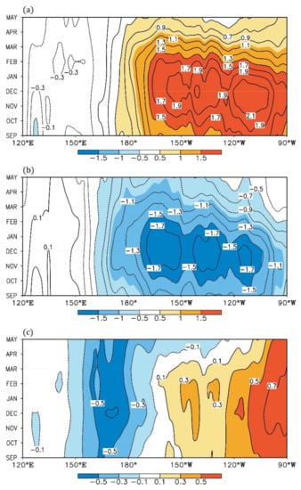 In general, the abnormal ENSO SST patterns in the decaying spring maintain their mature phases due to the strong persistence of the SST anomalies. Figure 4 further shows the evolution of SST anomalies along the equator in the Pacific Ocean from the developing autumn to the decaying spring. In the El Niño events, the SST over the equatorial eastern Pacific is abnormally warmer, and the abnormal SST center is generated from the east to the west during the developing autumn to the decaying spring (Figure 4a). On the other hand, the situation in the La Niña events is mainly the opposite: the SST is abnormally colder over the equatorial eastern Pacific (Figure 4b). Meanwhile, we also note that the SST anomalies move westwards in the La Niña events. The summation of the El Niño and La Niña SST anomalies can highlight their nonlinearities []. Therefore, Figure 4c shows a relatively warmer and colder SST over the tropical eastern and central Pacific, respectively. This indicates that the SST anomalies in El Niño are relatively stronger over the eastern Pacific, while the ones in La Niña are stronger over the central Pacific from the developing autumn to decaying spring. This indicates a westward shift of the SST anomalies during the La Niña events compared to El Niño.