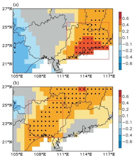 Correlation coefficients between the spring precipitation anomalies and the preceding winter ONI for the years with (a) ONI > 0 and (b) ONI < 0. The dotted areas are significant with p < 0.1. All data are linearly detrended. The red boxes in (a) and (b) denote the Guangdong province and Guangxi province regions, respectively.