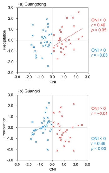 The above findings exhibit obvious asymmetries in the two types of ENSO SST anomaly phases and their atmospheric circulation responses in the decaying spring. The ENSO-induced atmospheric circulation anomalies suggest that El Niño potentially affects spring precipitation over Guangdong province, while La Niña potentially exerts an effect on spring precipitation over Guangxi province. As shown in Figure 7, the relationship between the South China spring precipitation and the ENSO SST anomalies exhibits evident asymmetries. For the years with ONI > 0, i.e., the positive ENSO phases, the winter ONI only bears a strong positive correlation with the decaying spring precipitation over Guangdong province (Figure 7a). However, during the years with ONI < 0, i.e., the negative ENSO phases, such a strong positive correlation shifts westwards to Guangxi province (Figure 7b), while it is much weaker over the Guangdong province. This implies that the effect of ENSO on the decaying spring precipitation over South China moves westwards in La Niña compared to El Niño.