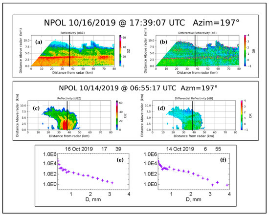 For all events, the NPOL radar had performed the regular routine scans. Figure 2 shows two examples of RHI scans over the disdrometer, one on 16 October (Zh in panel (a) and Zdr in panel (b)) and the other on 14 October 2019 (Zh in panel (c) and Zdr in panel (d)). The top two panels show stratiform rain over the disdrometer site (which is marked with black lines), indicated by the clear presence of a radar bright band due to the melting layer between 3 and 3.5 km height above ground level (a.g.l.). The melting layer is visible in both Zh and Zdr. By contrast, panels (c) and (d) in Figure 2 do not show any radar bright band in the entire RHI scan, thus it can be classified as convective rain. Panels (e) and (f) show the 1 min composite DSDs measured by the disdrometers at the same times as panels (a)/(b) and (c)/(d), respectively. For the latter, larger drops can be seen, with maximum recorded diameter (equi-volume drop diameter, Deq) of nearly 4 mm, whereas for the former, it is just over 3 mm.