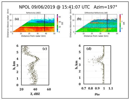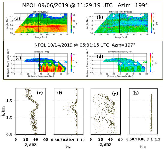 The fitted equations were applied to the radar scans, and two sets of example results are shown in Figure 12. They correspond to the two cases presented earlier in Figure 3. The radar data processing was carried out using the same set of procedures as outlined in Reference [36], including attenuation correction procedures for all Zh and Zdr range profiles.