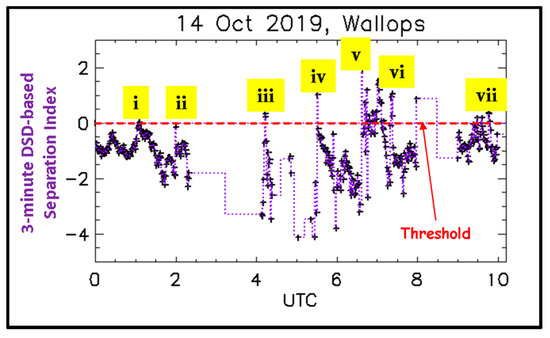 The index values (derived from 3 min DSD-based NW–Dm) for 14 October 2019 are shown in Figure 5 for the whole duration of the event. The separation line (i.e., i = 0) is also included. As seen, there are several ‘points’ (i.e., time periods) where i was positive or close to 0. These are numbered from (i) through to (vii) and highlighted in yellow. The corresponding RHI scans from NPOL are given in Figure 6. For all seven instances, the arrows point to the precipitation structure above the disdrometers.