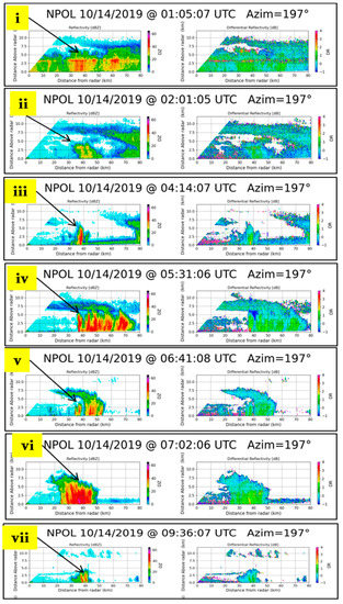 NPOL RHI scans of Zh and Zdr corresponding to cases (i–vii) in Figure 5. The arrows point to the vertical profiles above the location of the disdrometers.