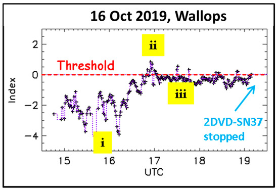 Next, we consider the event on 16 October 2019. This too lasted for several hours, and the index values based on 3 min DSDs are shown in Figure 7. They go above the zero threshold only at around 17:00 UTC. Three time periods are marked: (i) with index value well below zero, (ii) index value a little above zero, and (iii) index value is negative but close to zero.