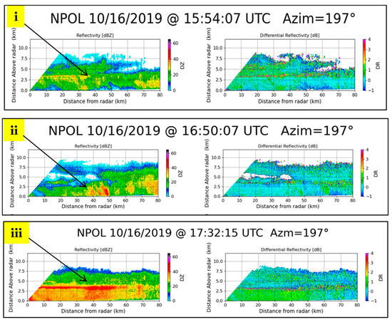 NPOL RHI scans of Zh and Zdr corresponding to cases (i)–(iii) in Figure 7. The arrows point to the vertical profiles above the location of the disdrometers.