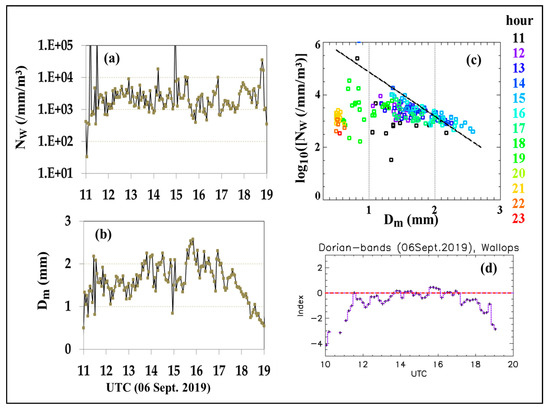 This event also lasted for many hours over the Wallops site. The NW and Dm derived from the measured 3 min DSDs are shown in Figure 9a,b over an 8 h period, and their variation against one another is shown in panel (c), where the colors represent different hours, as marked. Also shown is the separation line, as a dashed black line.