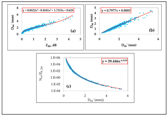S-band simulation results of (a) Dm′ versus Zdr, (b) Dm with Dm′, and (c) NW/Zh (linear) versus Dm′.