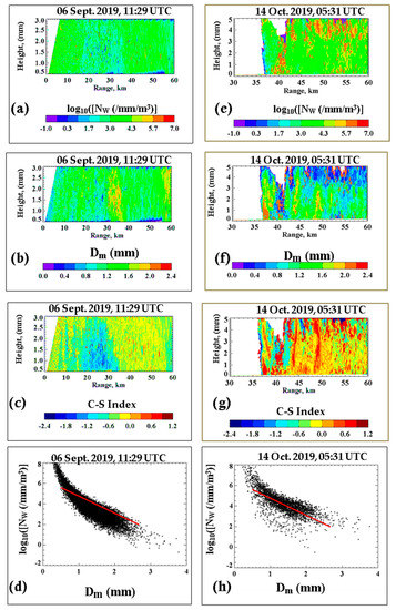 The differences between the two events can be clearly observed from Figure 12. NW shows more uniformity for the stratiform rain event and Dm shows significantly higher values (sometimes >2 mm) for some regions in the convective event. The index values are mostly negative for the 6 September 2019 case and mostly positive for the 14 October 2019 case. This not only lends support to the applicability of the separation method but also provides general support to our retrieval method for the DSD parameters from the NPOL radar scans. Note also from panels (d) and (h) that most points lie below the red line for the stratiform rain case, except for very low Dm points (which need to be categorized as light rain event and considered separately), while most points lie above the red line for the convective rain case.