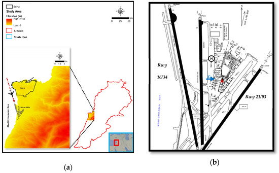 The airport of study is Beirut–RHIA, the only operational commercial airport in Lebanon, located in the Khaldeh suburb about 8 km south of the capital’s (Beirut) city center (Figure 1a). The airport is located on the eastern coast of the Mediterranean Sea, hence affected by a Mediterranean climate. To the east of the airport, Mount Lebanon—a mountain range sloping up to 2500 m—is located. Excluding its western side (Mediterranean Sea), Beirut Airport is embedded in a very urbanized area. Additionally, its eastern side is in close proximity to an industrial zone.