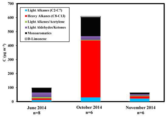 During the second fall/winter campaign (November 2014), the most abundant VOCs were acetone (6.8 µg m−3), n-hexane (6.5 µg m−3), n-nonane (5.7 µg m−3), n-decane (4.0 µg m−3), 1,2,4-TMB (3.6 µg m−3), ethylene and acetylene (2.21 µg m−3) (see Table S6).