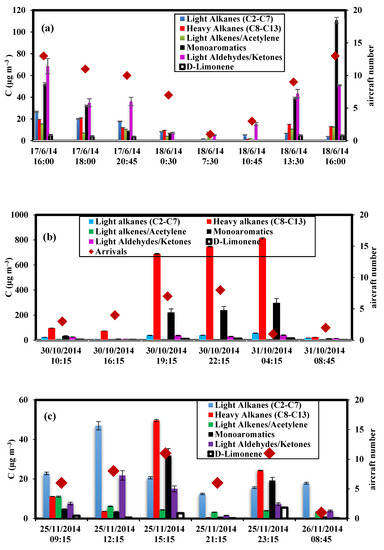 Figure 3 presents the temporal variations of the concentrations of VOC families and their correlation to the number of arriving aircraft, calculated by counting the number of aircraft arriving within the past 2 h before the end of the sampling. According to Figure 3, a very interesting correlation exists between the number of arriving aircraft with the concentrations of VOCs, specifically for heavy alkanes, aldehydes and ketones and monoaromatics. For example, at 16:00 on 17/6/2014 (see Figure 3a) the concentrations of heavy alkanes, light aldehydes/ketones, and monoaromatics (combustion products) are maximum (rush hour). Afterwards, these concentrations decrease gradually until they become very low at 07:30 (very low traffic) and increase again to reach another maximum at 16:00 (rush hour). Additionally, at 04:15 on 31/10/2014 (see Figure 3b), the concentrations of the aforementioned VOCs peaked due to the precedence of night-time rush traffic.
