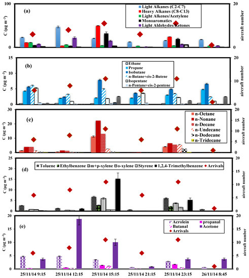 Temporal Variations of individual VOCs concentrations classified by family determined by GC-FID from measurements performed in the arrivals hall campaign (Beirut Airport, 25–26 November 2014) (a) Total VOC families, (b) Light alkanes, (c) Heavy alkanes, (d) monoaromatics (e) light aldehydes and ketones. These concentrations were obtained from sampling for 30 min at 100 mL min−1. Note that n-tetradecane (heavy alkane, C14) was not detected during the indoor measurement campaigns. The red diamonds correspond to the number of aircraft arriving within the past 2 h before the end of the sampling. Error bars represent the absolute uncertainty (μg m−3) per VOC family, calculated as the sum of absolute uncertainties (Δc) of the individual VOCs.