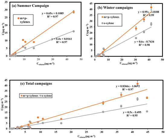 Examples of very strong correlations: the correlation between the indoor concentrations (µg m−3) of xylenes (m,p-xylenes and o-xylene) and toluene at the arrivals hall in Beirut Airport during (a) Summer (17–18 June 2014), (b) Fall/Winter (30–31 October 2014 and 25–26 November 2014), and (c) Total Campaigns. For the correlation, each set of data had the same weighting. Error bars represent the absolute uncertainties (μg m−3) of m,p- and o-xylene.