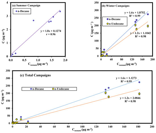Examples of strong and very strong correlations: the correlation between the indoor concentrations (µg m−3) of n-nonane, n-decane, and n-undecane at the arrivals hall in Beirut Airport during the different measurement campaigns: (a) Summer (17–18 June 2014), (b) Fall/Winter (30–31 October 2014 and 25–26 November 2014), (c) Total Campaigns. For the correlation, each set of data had the same weighting. Error bars represent the absolute uncertainties (μg m−3) of VOCs.