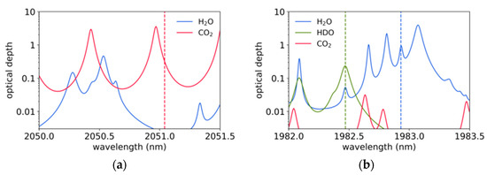 The first driving characteristic for the laser transmitter is its wavelength range of operation. Here two spectral windows of interest are being investigated and illustrated in Figure 1. The first spectral window is located in the vicinity of the CO2 R30 line at 2051 nm and has been specifically identified for CO2 probing from space by several numerical studies [2,3,4,5,6,7,8]. This spectral window also presents a side benefit from the instrumental point of view since the differential optical depths (DOD) achievable with this line is also compatible with operational test scenarios, e.g., ground-based range resolved DIAL like for example in [30]. The second spectral window is related to water vapor isotopic ratio measurement, for which a favorable spectral situation can be found around 1982 nm where HDO and the main isotope of water vapor have separated absorption lines, with potential accessible DODs also favorable for long-range resolved DIAL as illustrated in Figure 1. These properties are the main driving considerations for targeting this second spectral window. One side benefit from this choice is the fact that in the parametric conversion of an Nd:YAG radiation at 1064 nm, the natural idler wave for a signal at 1982 nm is located around 2297 nm, which is very close to potential CH4 absorption line candidates for measurement from space [5]. This aspect has, however, a much more limited scope since power extraction will generally be optimized in favor of one wavelength, which will disadvantage the other one. As will be illustrated in the following sections, our design is oriented toward signal wave power extraction.