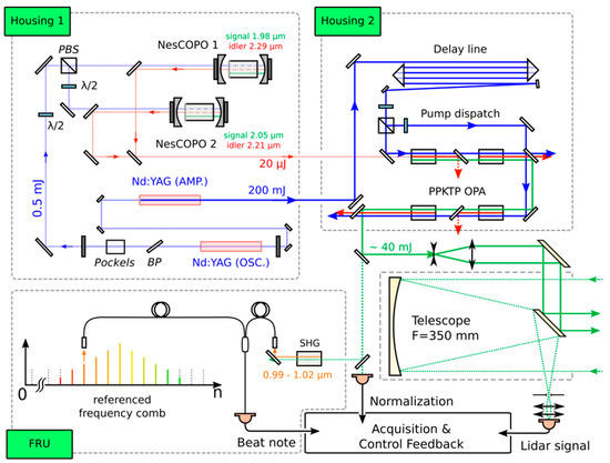 The LEMON instrument architecture is based on the combination of different technologies and is schematically depicted in Figure 2. It is composed of: (i) a laser transmitter module consisting of two separate housings, which emits the laser radiation to probe the targeted gas absorption lines; (ii) a frequency reference unit (FRU), which provides the frequency of the emitted laser radiation with high accuracy; (iii) an acquisition and receiver module to collect, detect, and acquire the DIAL signals; (iv) a software and electronic control system to control the emitter unit, record, and analyze the data. This paper is focused on the transmitter module and the frequency reference unit.