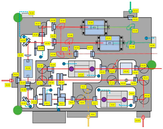 The pump laser design (development by InnoLas, H1-1 to H1-25 in Figure 3) is based on a diode pumped, injection seeded Nd:YAG laser in a master-oscillator power amplifier configuration (MOPA). The laser radiation is generated in a folded oscillator between the partially reflecting rear and out-coupling mirrors H1-1 and H1-15 to reach the necessary pulse duration of about 15 ns. H1-2 to H1-4 illustrate components for Q-switching, H1-8 the active laser medium, and the remaining components in between the partially reflecting mirrors are for beam shaping and guiding. H1-6 and H1-53 are optical fibers for the injection seeding of the laser system. This allows for running the laser in a single longitudinal mode operation. After the out-coupling mirror (H1-15), the laser beam is guided through an amplifier (H1-20) and emitted through a polarizer (H1-25) to feed the consecutive OPA in housing 2 (see Section 3.2). The pump pulse energy will be over 200 mJ at a repetition rate of 150 Hz. A special pumping scheme will allow the operation in “quasi—75 Hz mode”, meaning that pairs of pulses with a delay of 500 µs are emitted at a repetition rate of 75 Hz. The beam quality is aimed to be M² < 1.5. As mentioned above, the rear mirror (H1-1) is also only partially reflecting. About 2 mJ of the oscillator radiation are coupled out through this mirror and guided over two piezo-controllable mirrors (H1-27 and H1-32) to pump the OPOs (H1-40 and H1-41). Indeed, less than 1 mJ is expected to be sufficient to pump the NesCOPO stages [29].