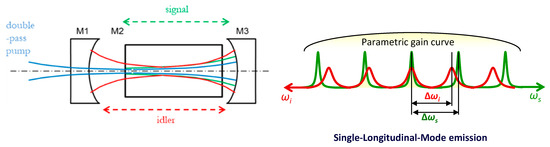 The optical parametric oscillator is a nested-cavity configuration, which allows obtaining a single frequency over a wide tuning range without any injection seeding devices [40]. Indeed, as illustrated in Figure 4, using such a doubly-resonant configuration, with different cavity lengths for the signal and idler waves, it is possible, if the parametric nonlinear crystal bandwidth is narrow enough, and with an adequate signal and idler cavity dissociation, to have only a single pair of modes {ωsi} of the signal and idler cavity frequency combs respecting the energy conservation (i.e., ωp = ωs + ωi, with the pump, signal, and idler angular frequencies ωp,s,i), leading to single-longitudinal-mode emission.