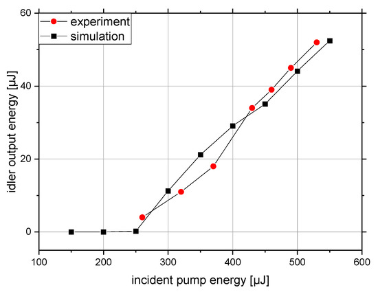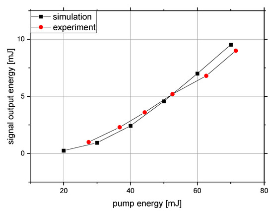 Figure 12. Measurement and simulation results of the signal output pulse energy of an OPA stage in dependency of the incident pump power.