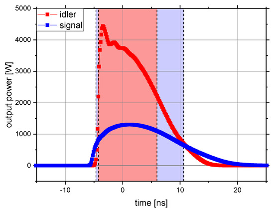 The simulations also determined the expected temporal shapes of the output pulses (Figure 6), which later served as input to the numerical calculations for the design of the amplifier stages. The shaded areas denote the full width at half maximum (FWHM) pulse durations at the respective wavelength. A difference between signal and idler pulse durations results from a larger cavity finesse of the NesCOPO at the signal wavelength.