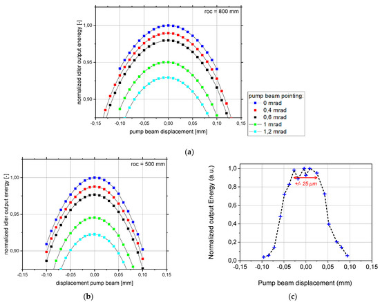 Figure 7. Calculated output idler pulse energy of the NesCOPO in dependency of spatial pump beam displacement. The given angles denote a tilt between the pump beam and the NesCOPO’s optical axis. Results with mirror radii of 800 mm are reported in (a). Results with mirror radii of 500 mm are reported in (b), experimental results with 500 mm mirror radii are reported in (c).