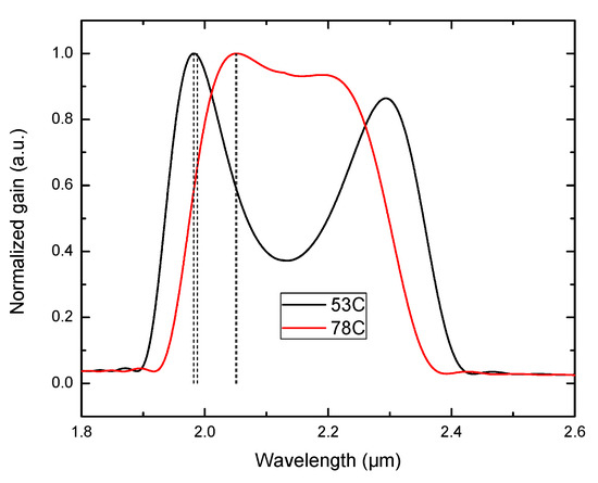 Figure 8. The calculated gain spectra in 10 mm PPKTP with 38.75 µm period at temperatures of 53 °C (solid black line) and 78 °C (red line). The Dotted lines indicate the target spectral ranges.