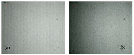 Figure 9. Microphotographs of c+ (a) and c- (b) polar surfaces in 5 mm thick PPKTP. The selective chemical etching was used to reveal a ferroelectric domain structure with 38.75 µm periodicity.