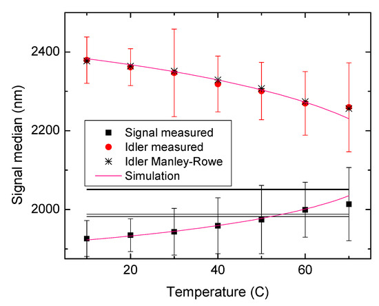Figure 10. Signal and idler wavelengths as a function of temperature in the OPO comprising PPKTP with 38.75 µm periodicity. Measured peak wavelength (solid points), idler wavelength determined from Manley–Rowe relations (crosses), and calculation (red line). Horizontal lines determine the target spectral ranges. Error bars demarcate the FWHM of the measured spectra.