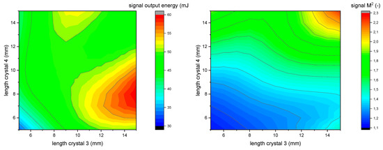 Figure 13. Calculated output pulse energy (left) and beam quality factor (right) after the second OPA stage in dependency of crystal lengths between 5 and 15 mm for an idler seeded OPA. The first stage consists of two 12 mm long crystals and the idler wavelength is coupled out in between all four crystals.