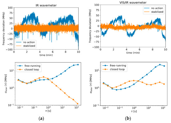 Figure 15. NesCOPO preliminary frequency locking experiments: (a) the wavelength measured by the wavemeter used in the control loop; (b) the measurement using an independent wavemeter.