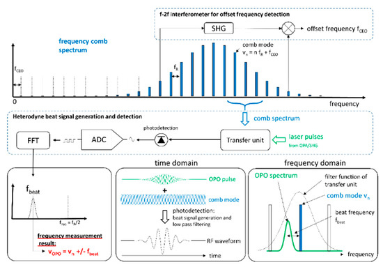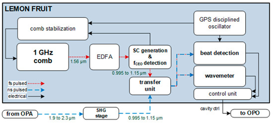 Finally, previous studies have also derived the spectral performances required for CO2 measurement from space, which are also summarized in Table 1. Besides the accuracy goal on concentration measurement for a given species, these spectral requirements strongly depend on parameters such as intrinsic line shape, absorption cross-section, and their dependency on temperature and pressure variations, which generally result in more stringent constraint for a measurement scenario from space. Indeed, to optimize the DOD as well as the sensitivity in the lower layers of the atmosphere, the laser is ideally required to be placed in the wings of the absorption line, which implies a higher uncertainty on the observed absorption for a given frequency uncertainty on the laser frequency. This is the case for CO2 sounding from space at 2.051 µm [2,4,5]. Once again, we take these most stringent values for CO2 measurement from space as the objective for the frequency accuracy in our design and add the capacity to address different spectral windows besides the 2.05 µm one. To reach this accuracy and capacity to adapt to multiple spectral windows, an optical frequency reference based on a stabilized frequency comb is proposed. The concept is schematically illustrated in Figure 2 and further detailed in Section 4.